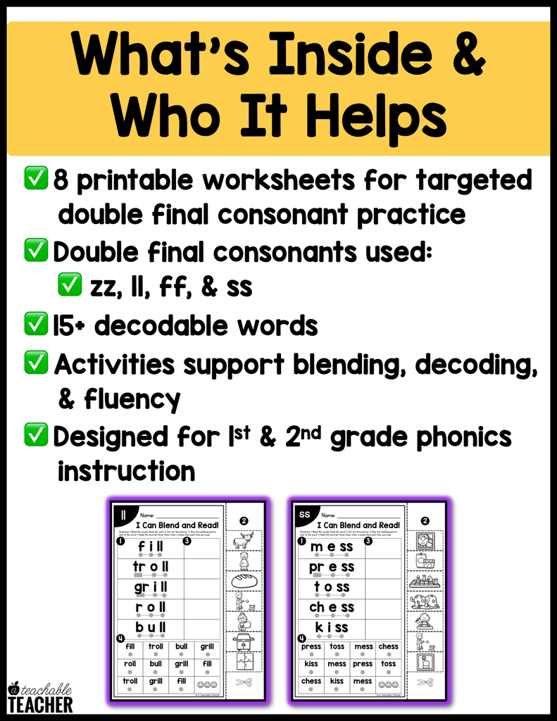 Oh, double consonants! Do your students struggle to blend word with double consonants and therefore read words with double consonants? These blend & read double consonant worksheets are exactly what you and your students need to start reading words with double consonants fluently!