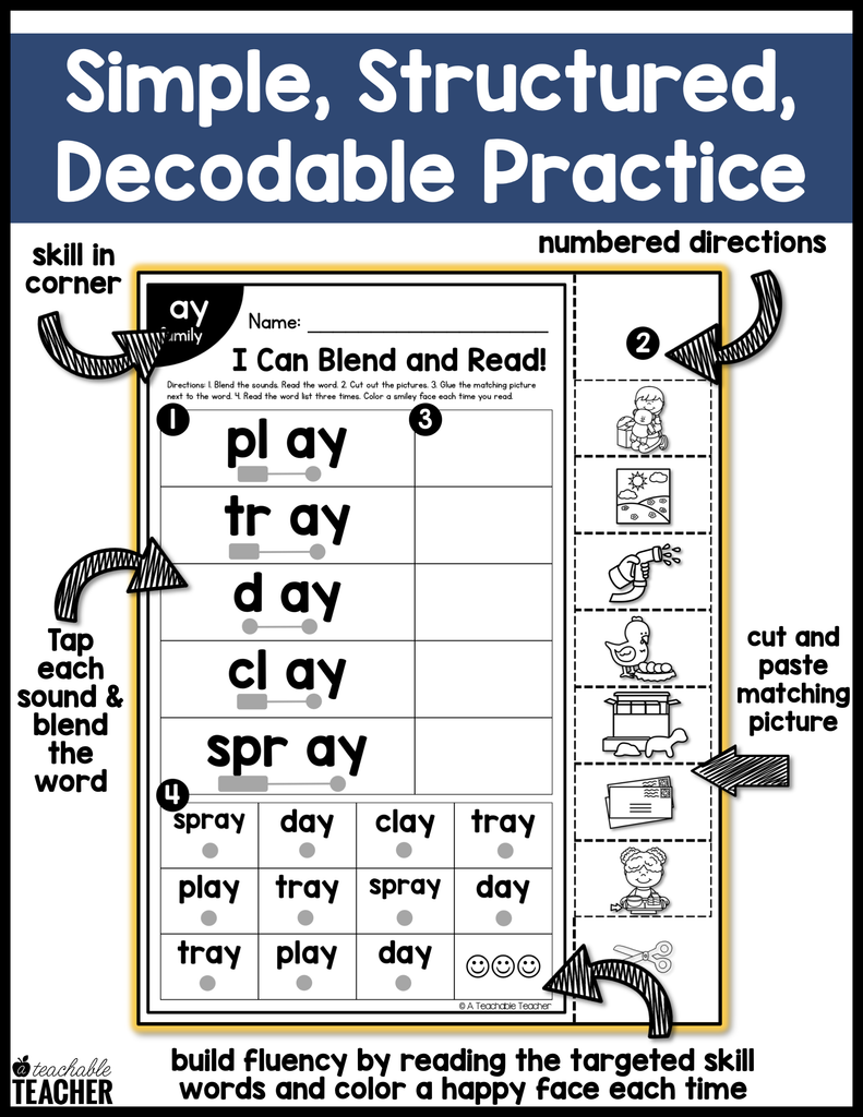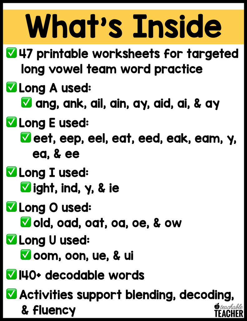 - The skill (long vowel word family or vowel team) in the upper left hand corner so that you can easily find the page(s) you need.