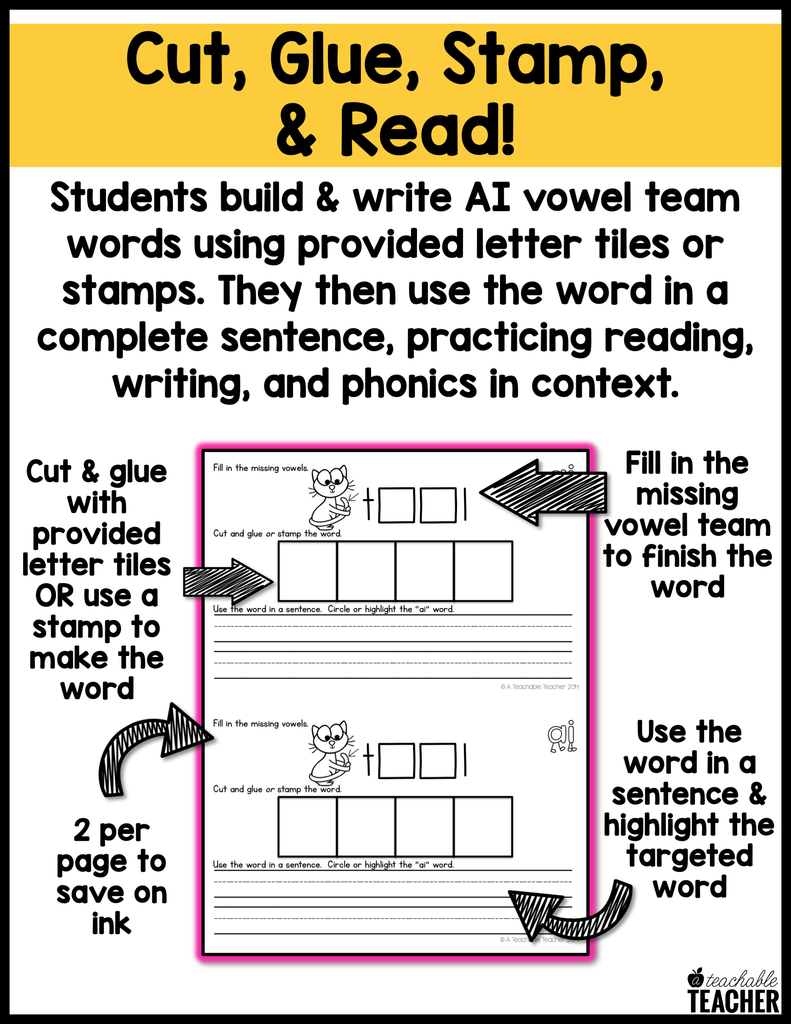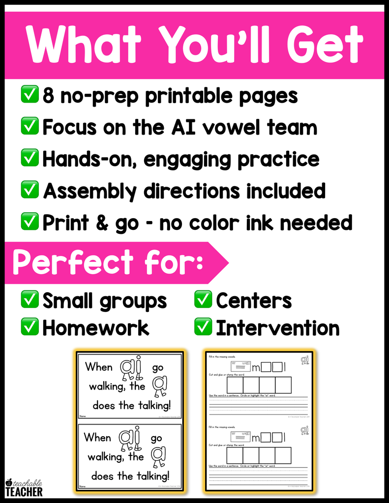 This AI Vowel Team Activity Book is perfect for your word work station, literacy centers, and/or introducing and reviewing AI words.
