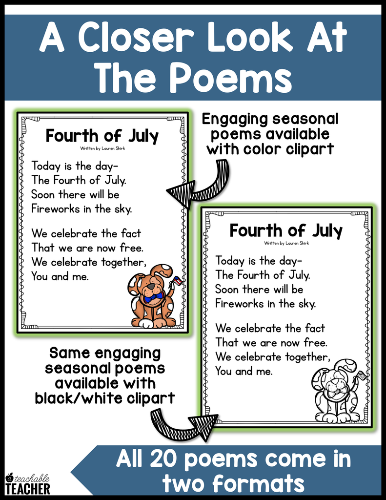Poetry is great for beginning readers! The rhyme provides predictable text, while poetry gives students a chance to practice reading fluently and with expression. In this pack you will find 20 original spring themed poems. Each poetry page has matching clip art. Pages are provided in both color and black and white.