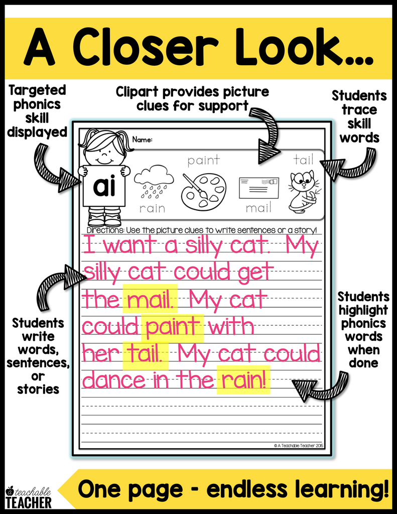 Each page provides the targeted phonics skill, matching clip art, traceable words, and writing lines. These pages can be used independently by students in writing centers, during Daily 5, for homework, or even as a spelling activity!