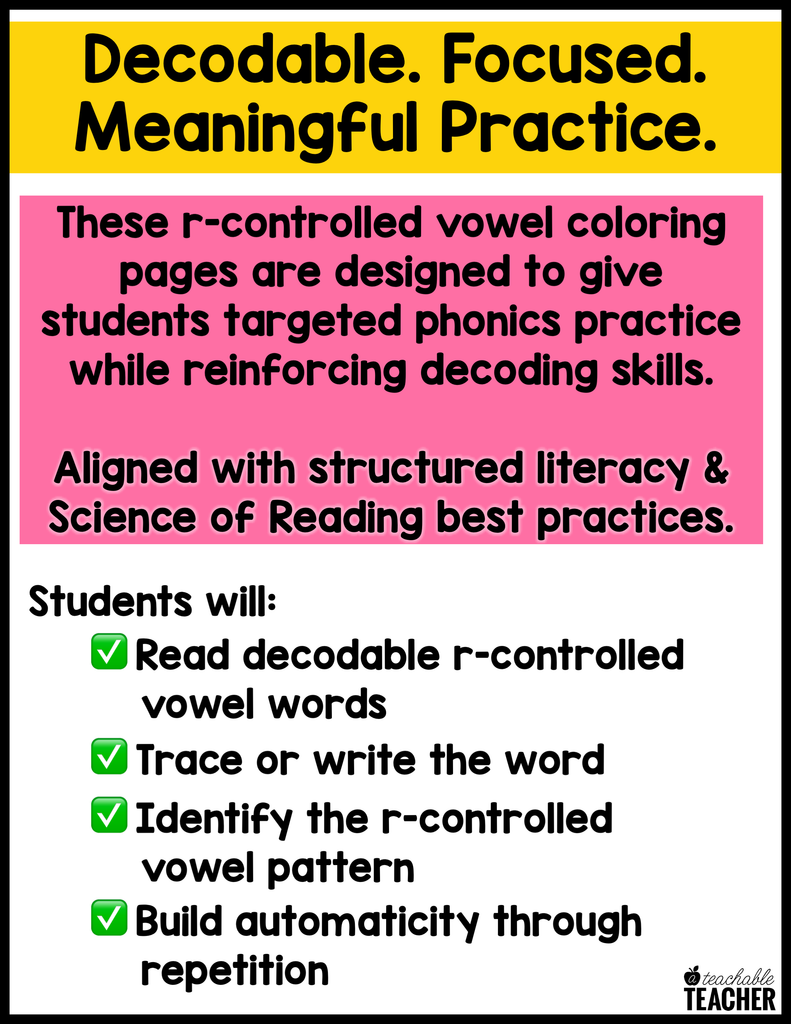 These 10 kid-friendly R-Controlled Vowel coloring pages are perfect for introducing a new R-Controlled Vowel, building fine motor skills with coloring, reviewing a R-Controlled Vowel, morning work, early finishers, testing, and more!
