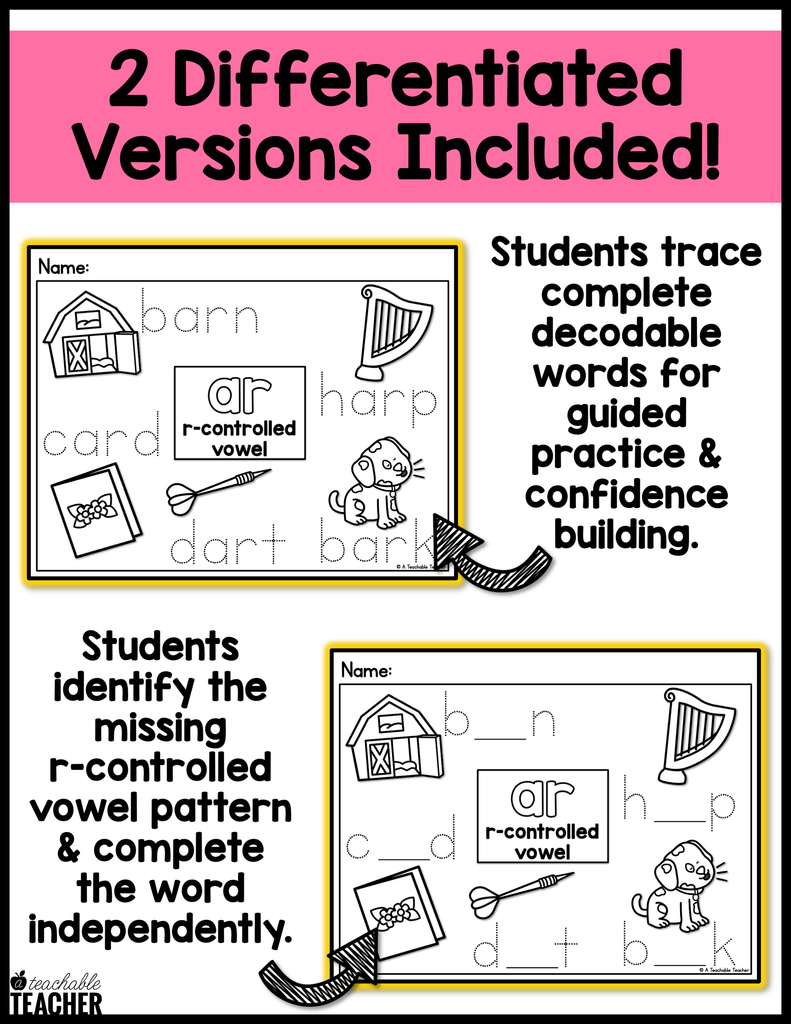 2 versions of EACH page are included! First version is for students to trace the whole R-Controlled Vowel word. The second version is for students to fill in the missing R-Controlled Vowel and the rest of the word is traceable.