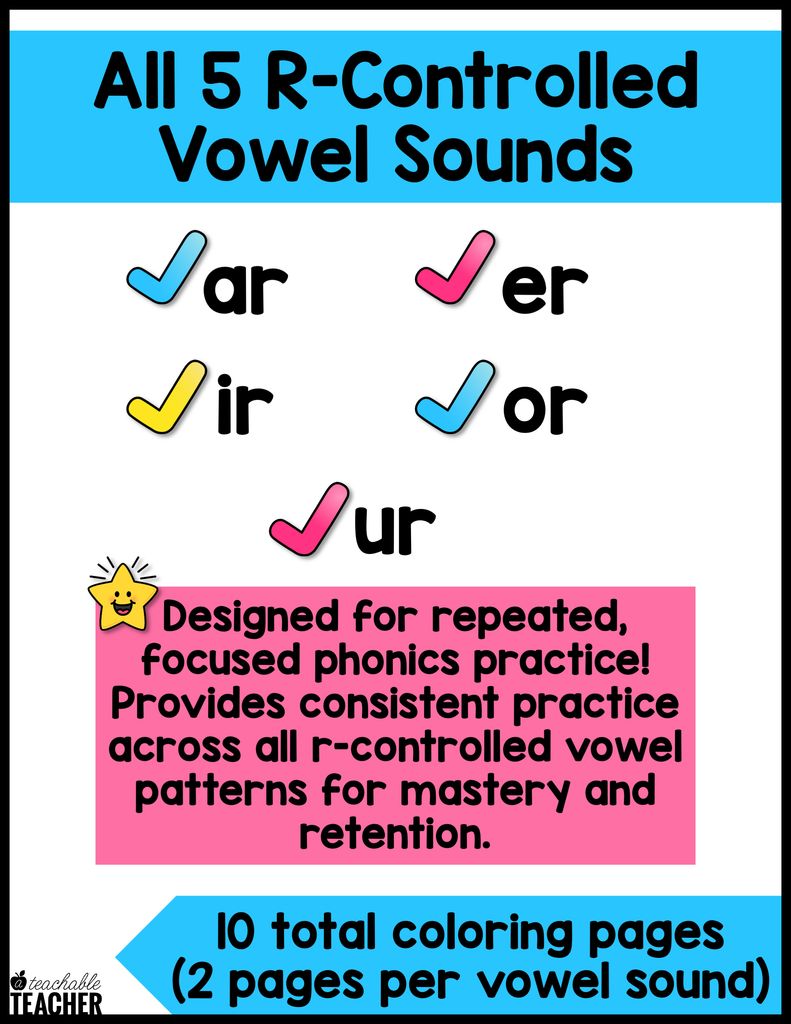 The 5 R-Controlled Vowels that are included in these coloring pages are: