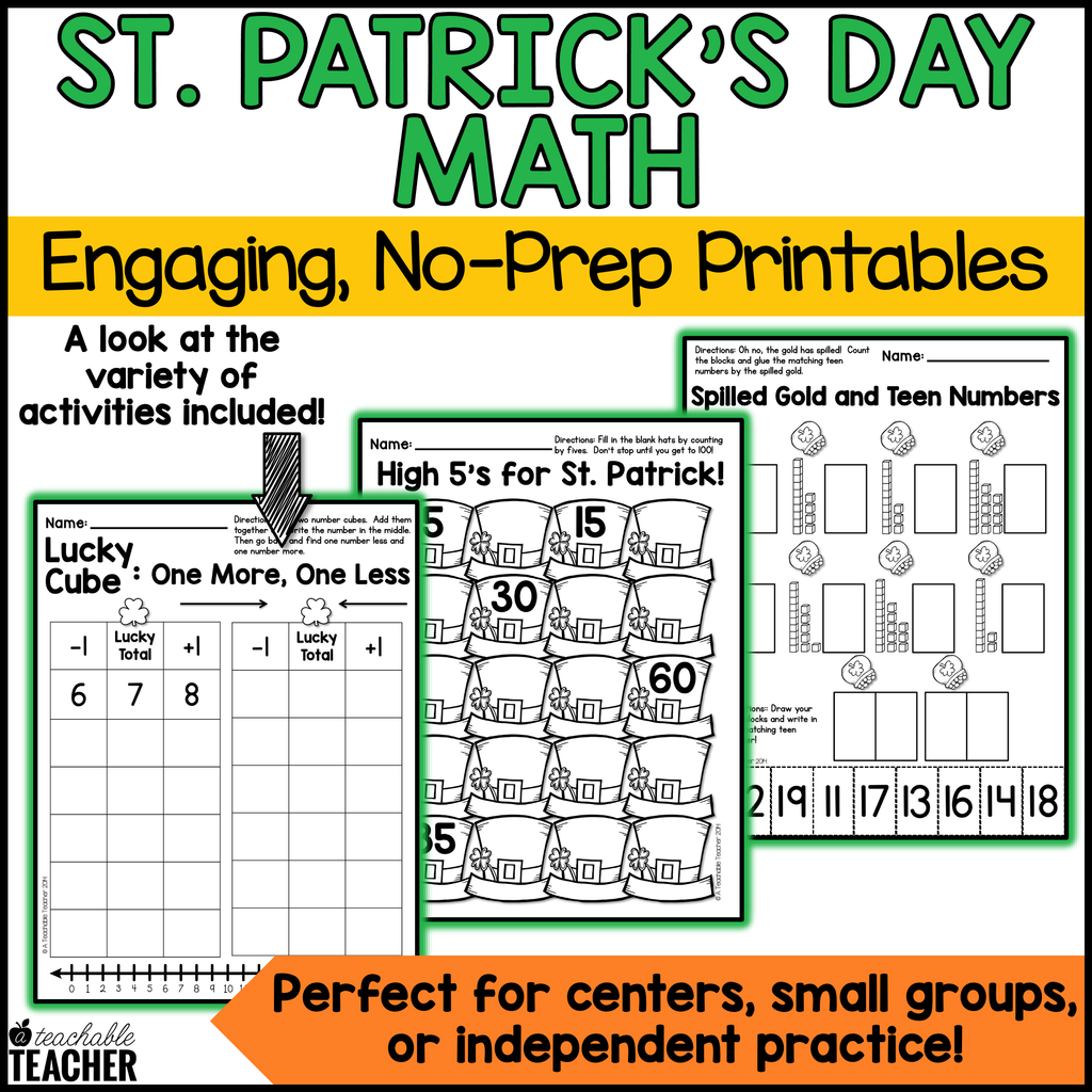 St. Patrick's Day Math has over 15 activities for St. Patrick's Day, including interactive worksheets, number cube activities (dice), a Shamrock Teen Numbers Counting Book, adding (with "manipulatives"), counting puzzles, and more!
