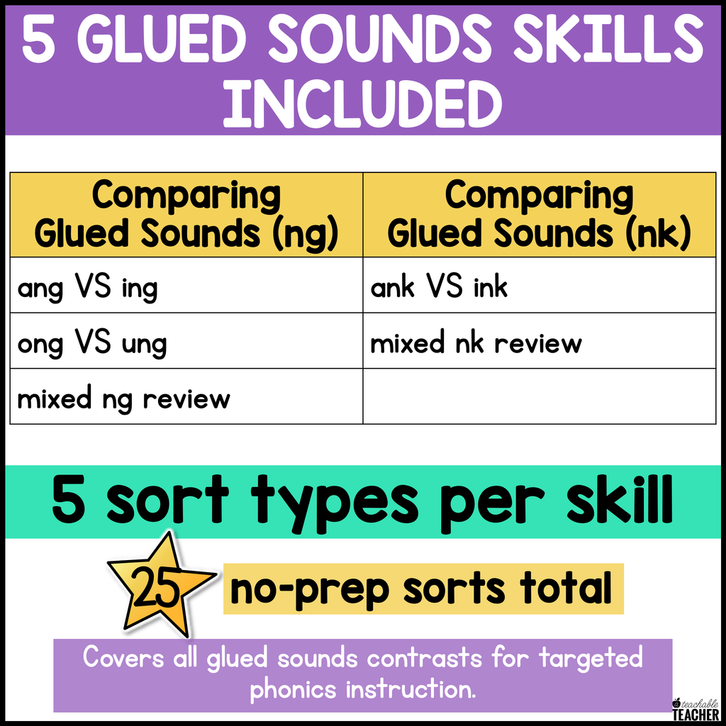 This foundational set includes 5 essential glued sound skills — focusing on nasal and nasal-k chunks like -ang, -ing, -ong, -ung, -ank, ink — with 5 engaging sort types per skill.