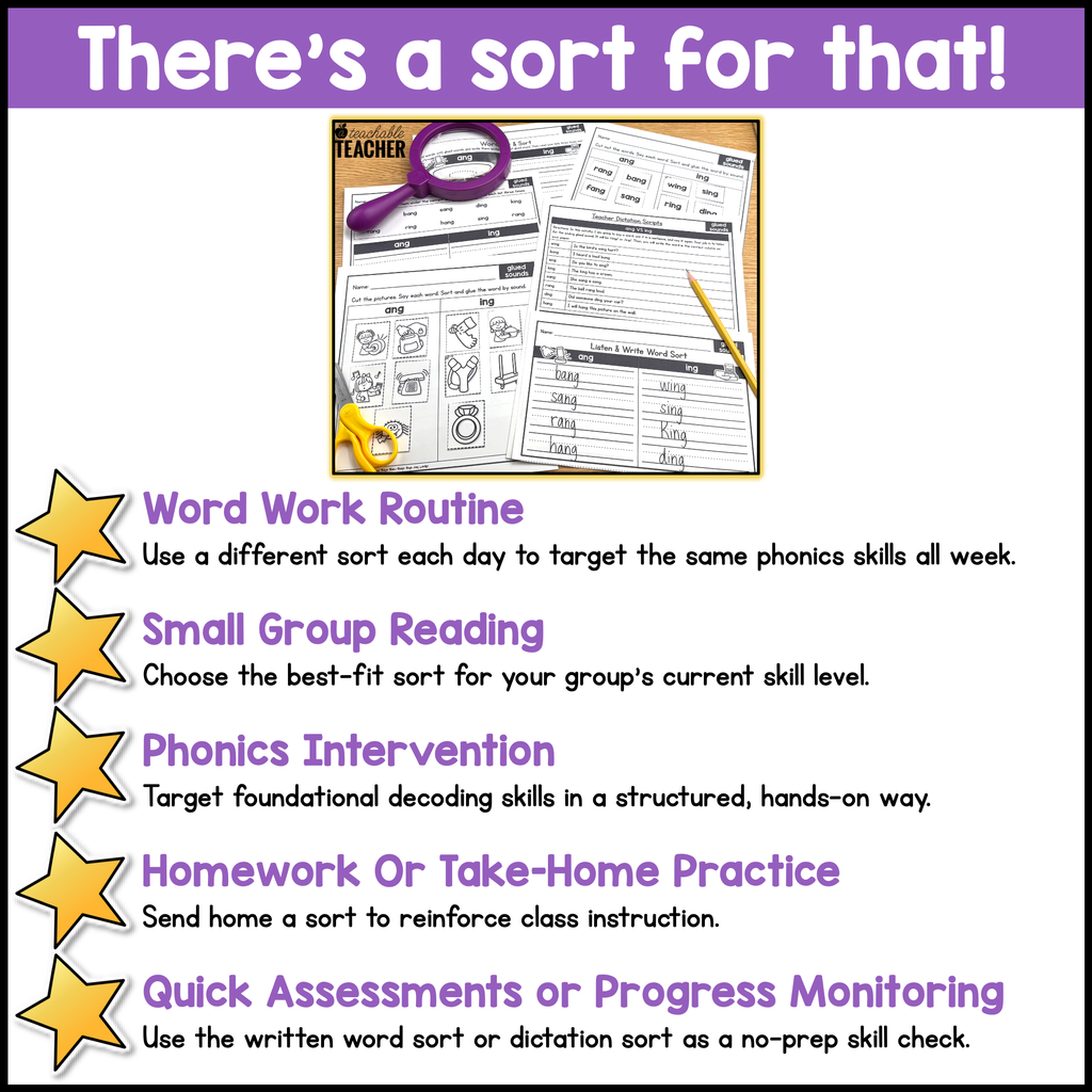Whether you’re introducing glued sounds or reviewing them in context, these sorts provide meaningful, no-prep support with built-in structure and flexibility.