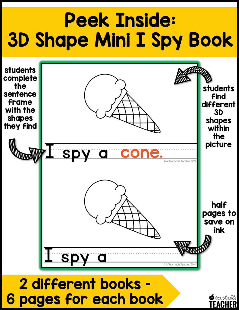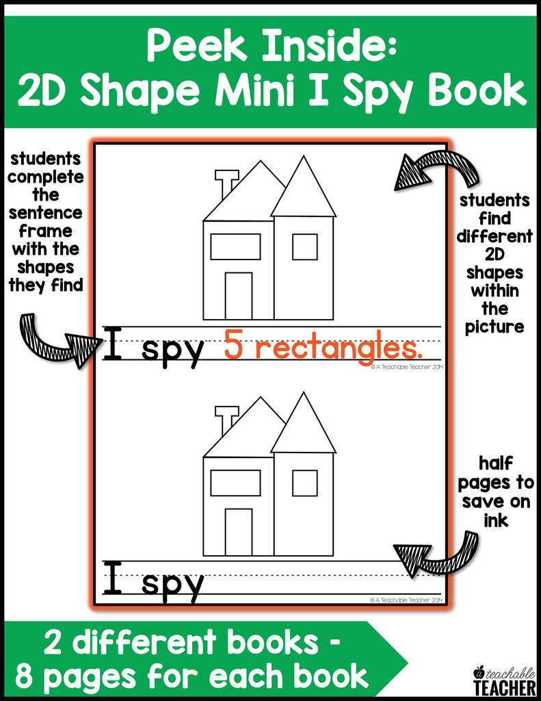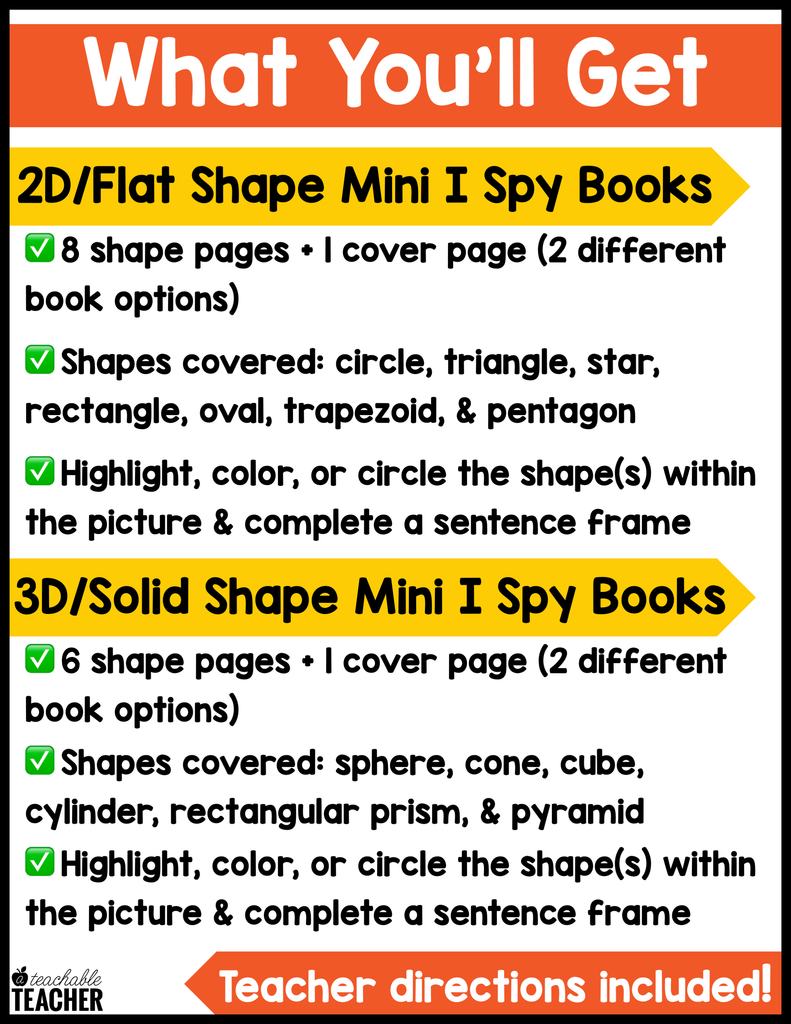 Your students will LOVE these activity books that require them to use their knowledge of shapes to "detect" or "spy" flat and solid shapes within a picture (clip art). See the thumbnails above for a photo preview!