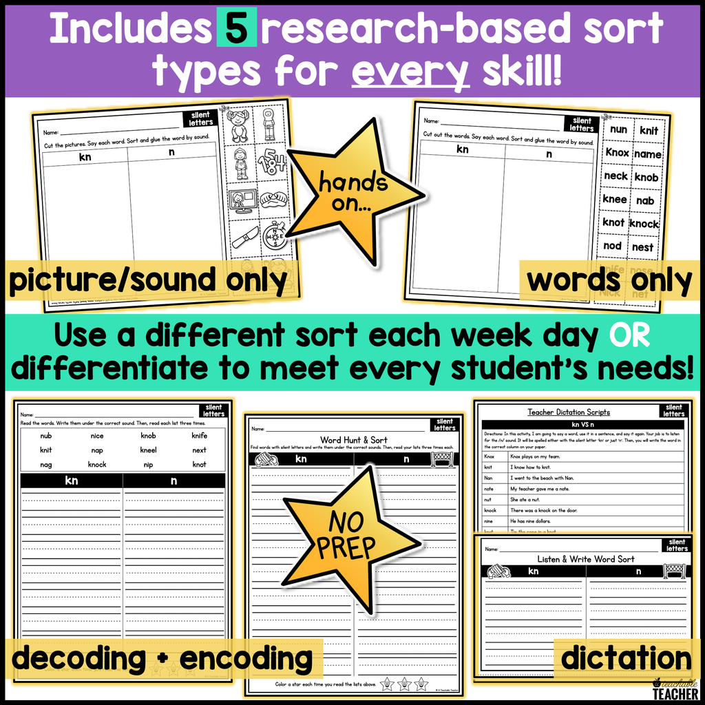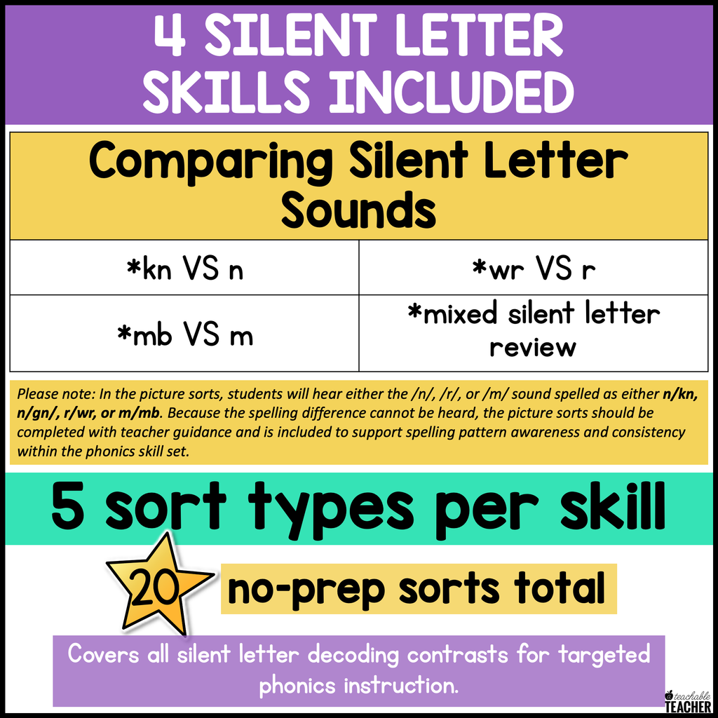 20 no-prep word sorts designed to help students decode, recognize, and internalize silent letter patterns in early reading!