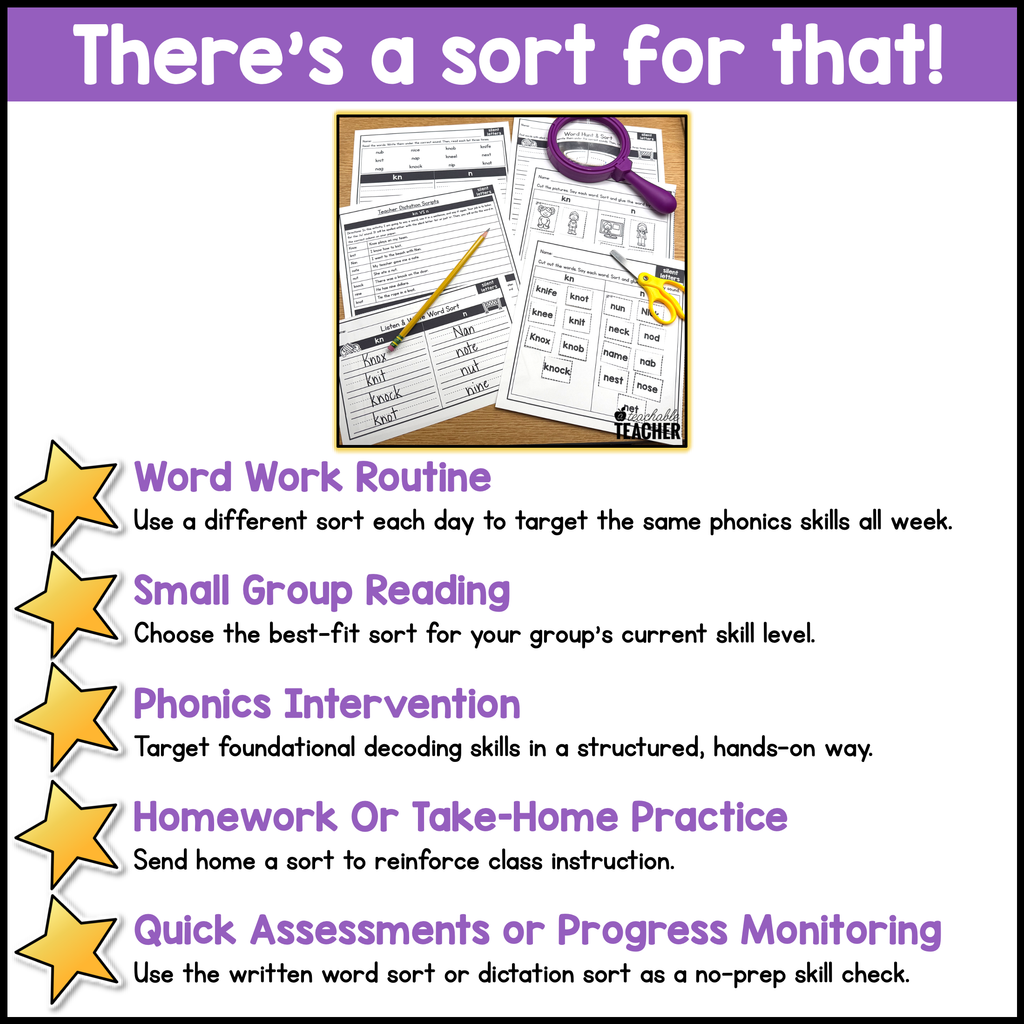 This set includes 5 high-frequency silent letter skills — from kn- to wr- to -mb — with 5 engaging sort types per skill. That gives you 20 printable phonics activities you can use for small groups, word work, or intervention.