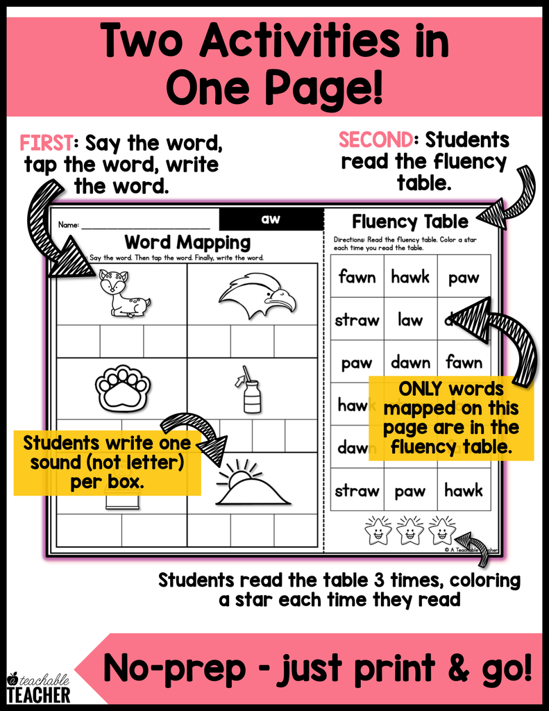 Implement this word mapping product *consistently* into your phonics routine and watch your students develop strong reading (and spelling) skills! Not only do these 11 phonics worksheets target word mapping, they also have a fluency component. And yes, it’s all on ONE page and NO PREP!